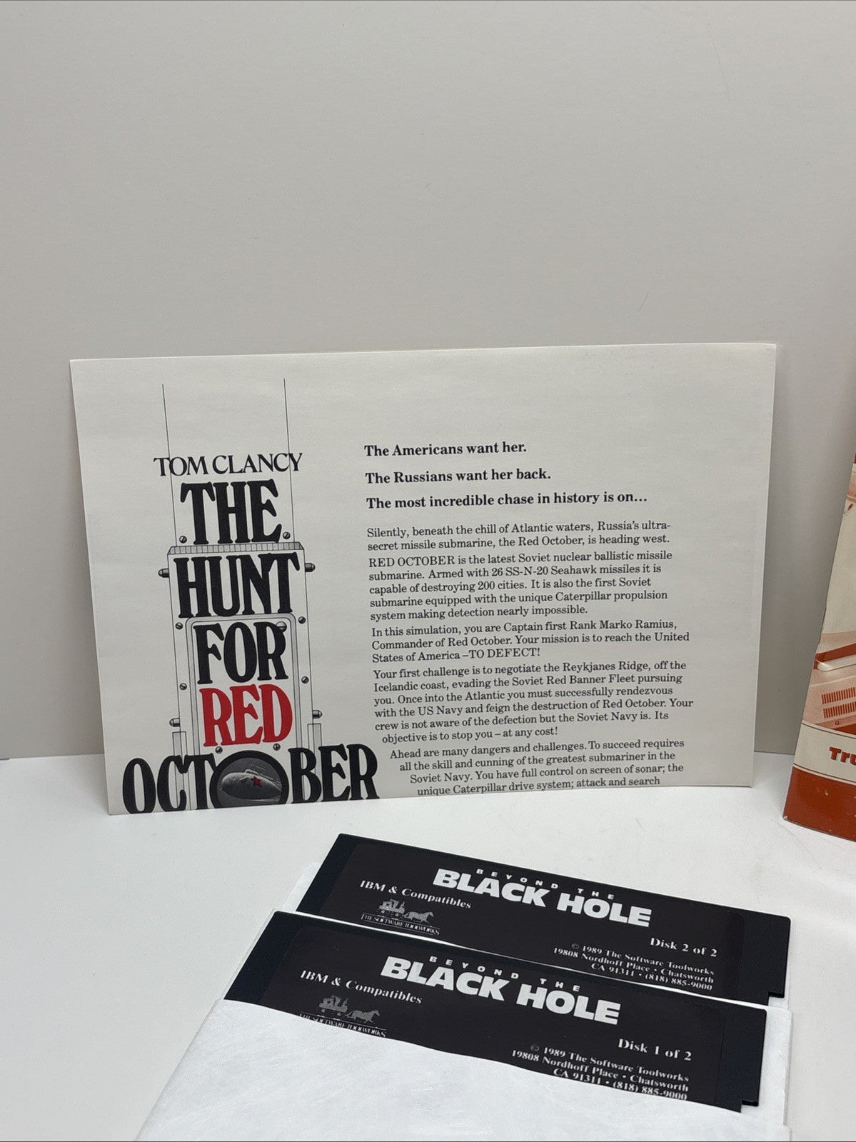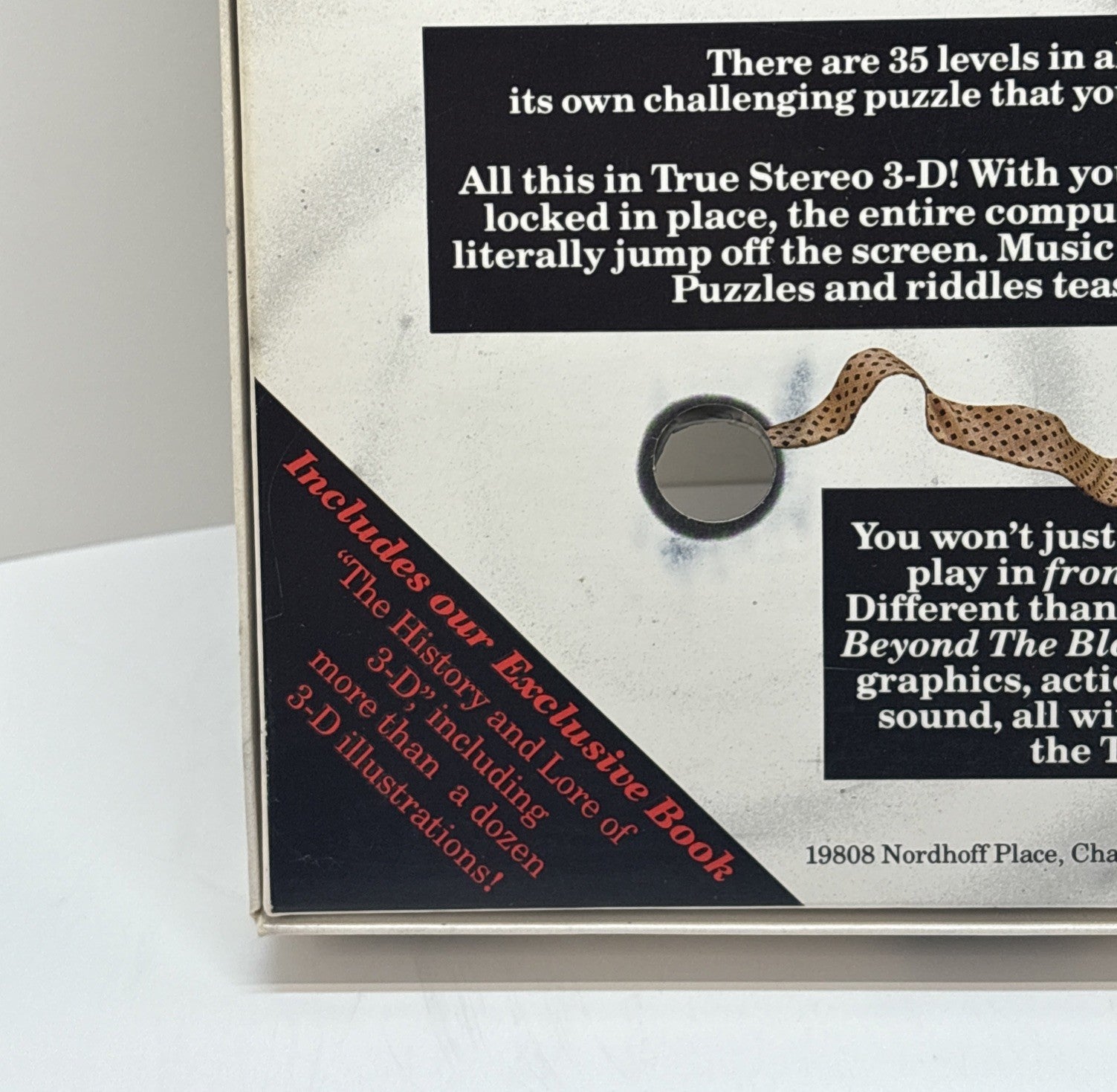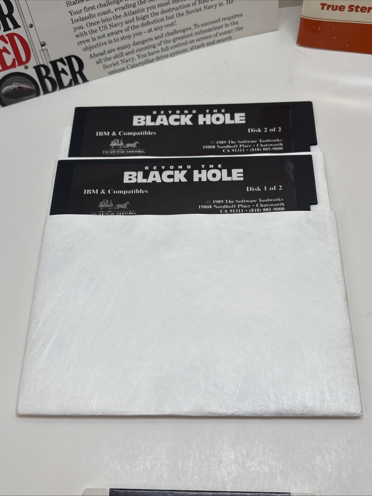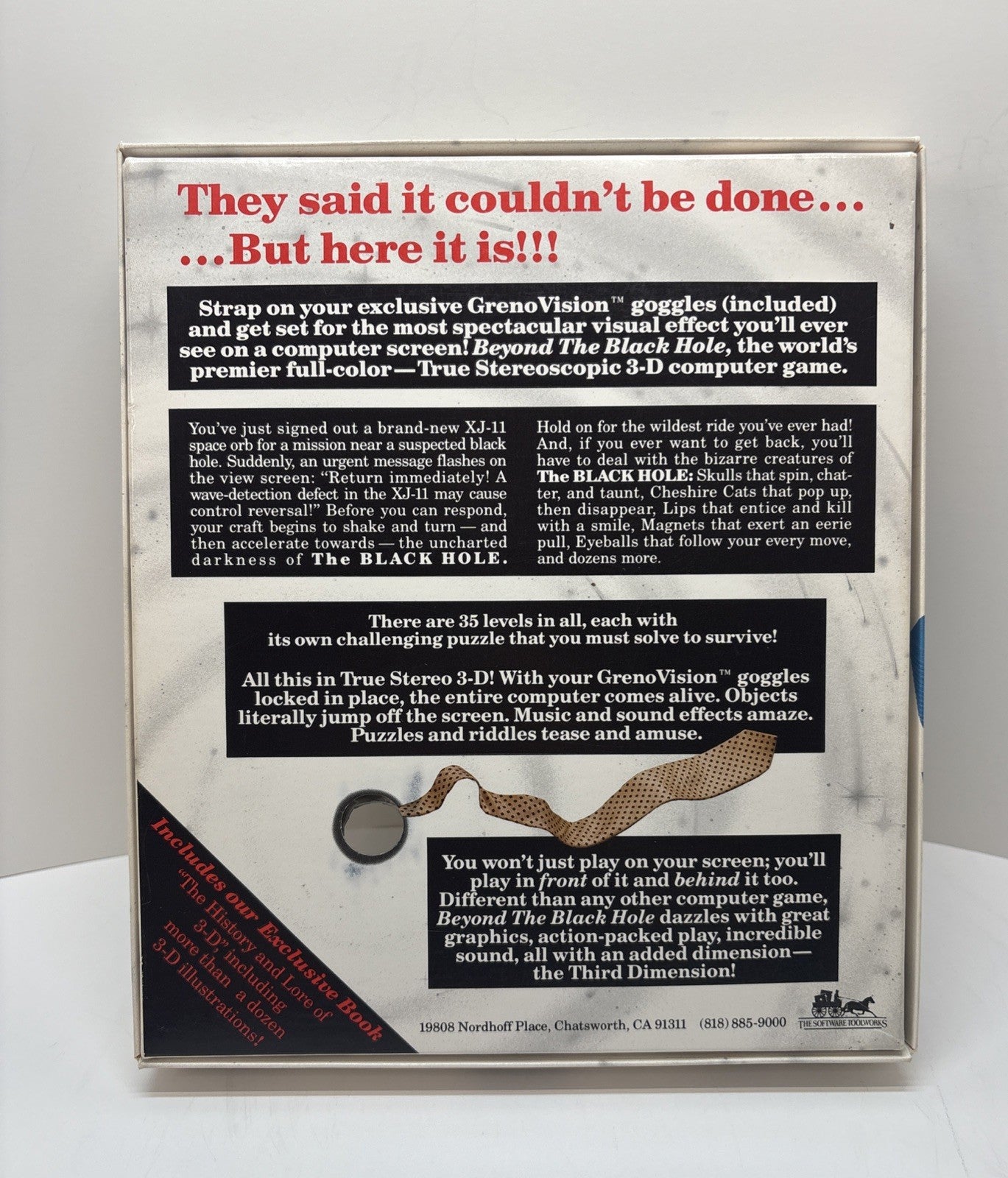 Very nice and complete copy of Beyond the Black Hole, the early stereoscopic 3-D PC game by The Software Toolworks. The big box shows some typical wear and surface marking but remains structurally solid. Contents are fully complete and well-preserved.
