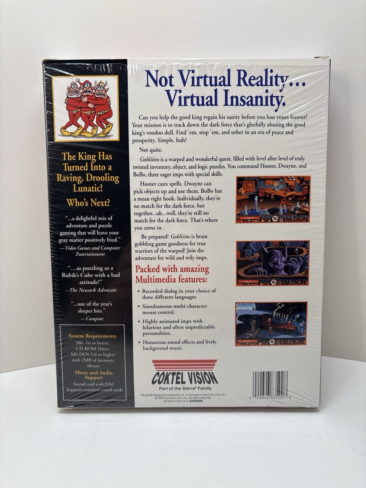 Step into the bizarre, humorous puzzle world of Gobliiins with this original Multimedia CD edition by Coktel Vision, part of the Sierra family of classic PC titles. The box retains most of its original shrinkwrap, with a small opening at the top allowing access — all interior contents are complete and in excellent condition.