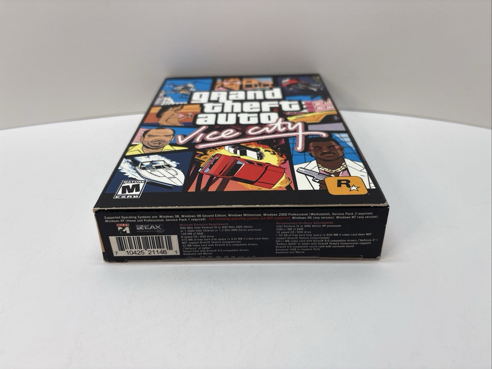 Classic early-2000s Rockstar release in its original big box format. This is the highly collectible PC big box edition with intense 1980s Miami-themed artwork.
