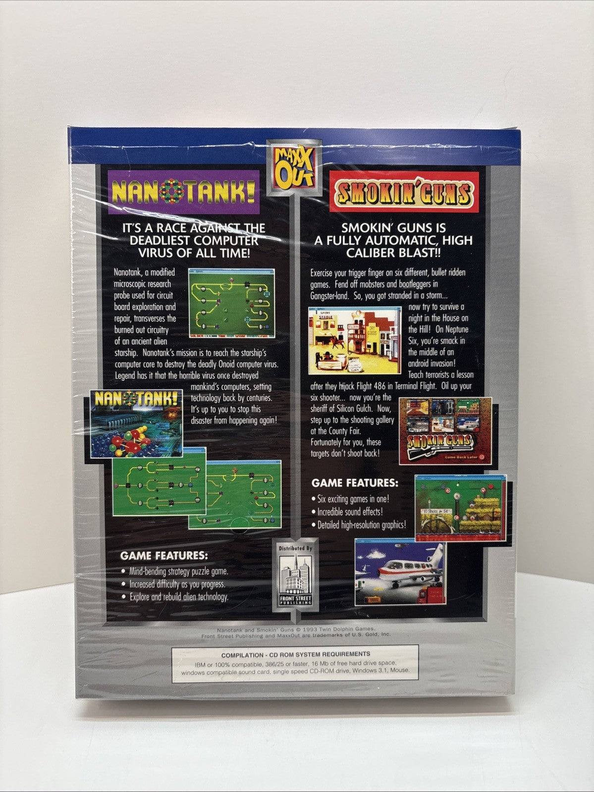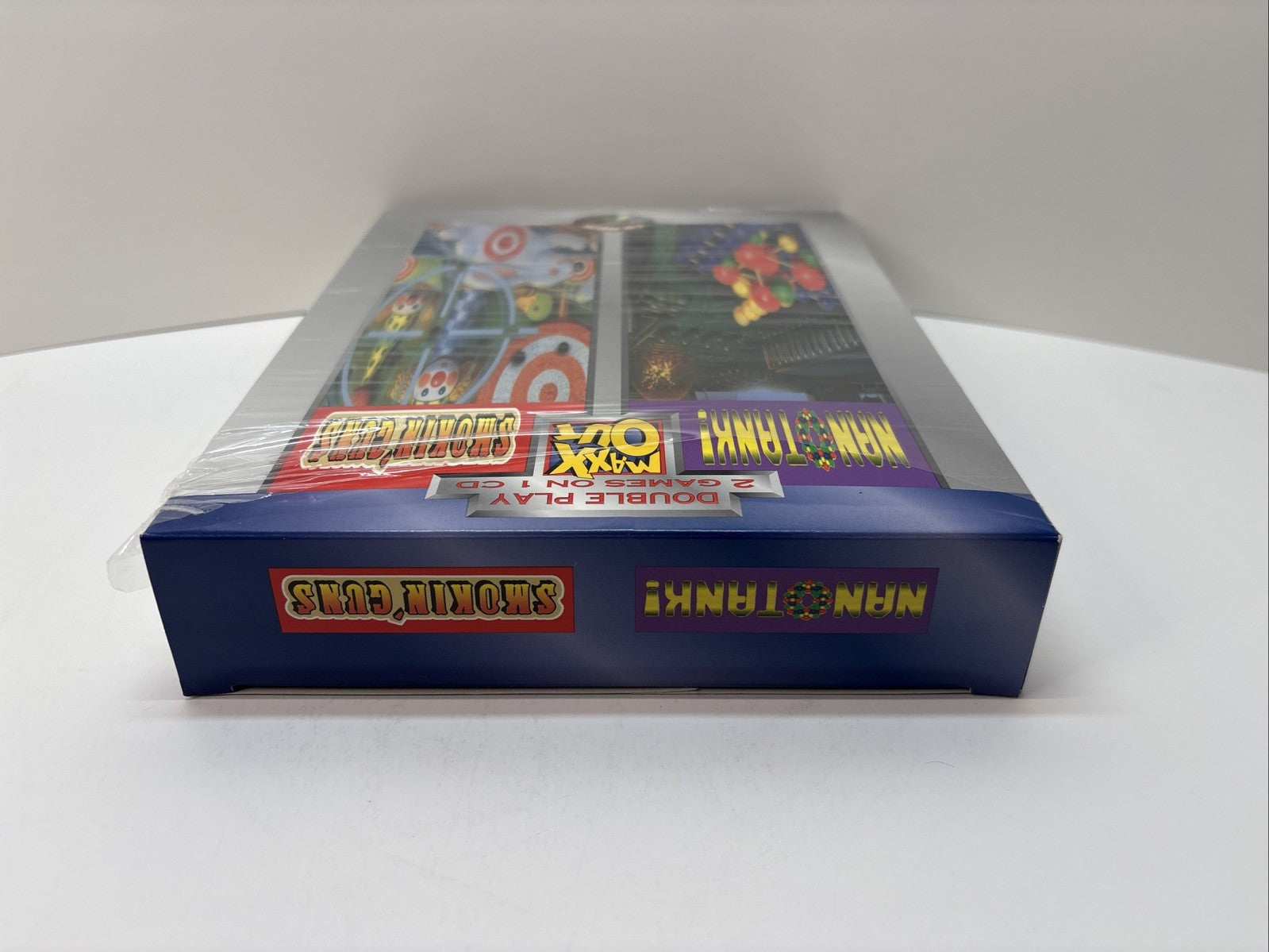 Experience a nostalgic dual-game PC compilation with this original Maxx Out Double Play — Nanotank & Smokin' Guns CD-ROM release. This item still retains most of its original shrinkwrap, with a partial opening on the top edge to access the contents. The interior components are complete and in excellent condition.