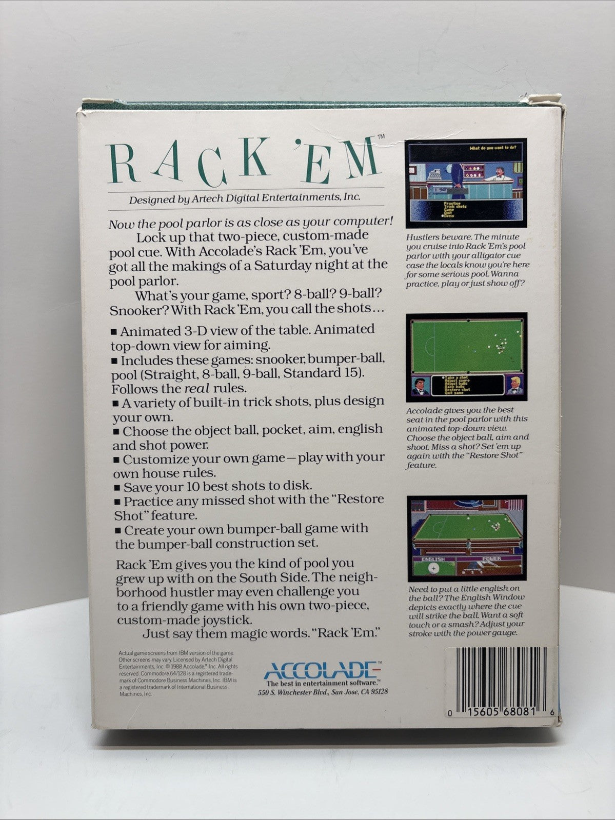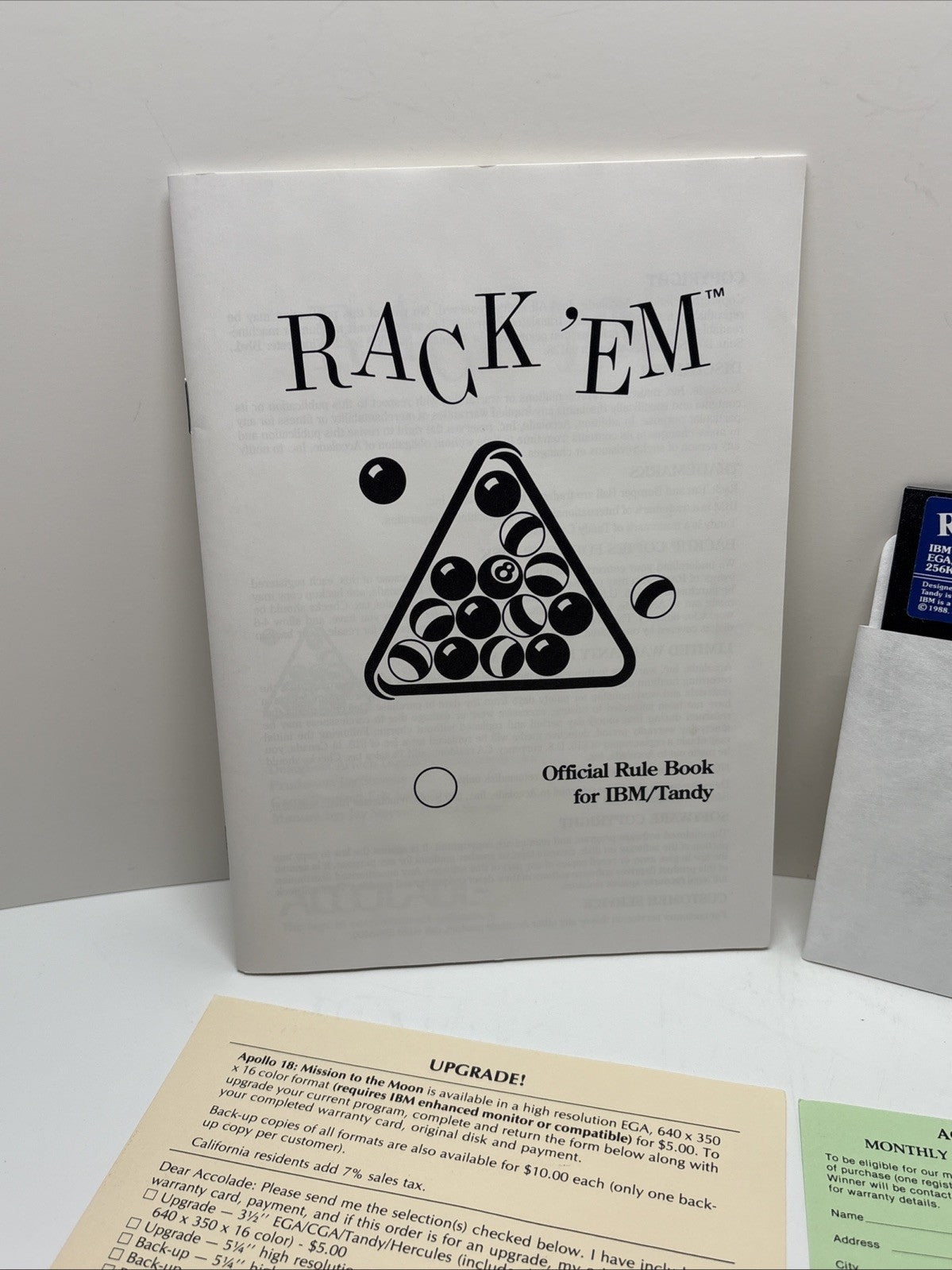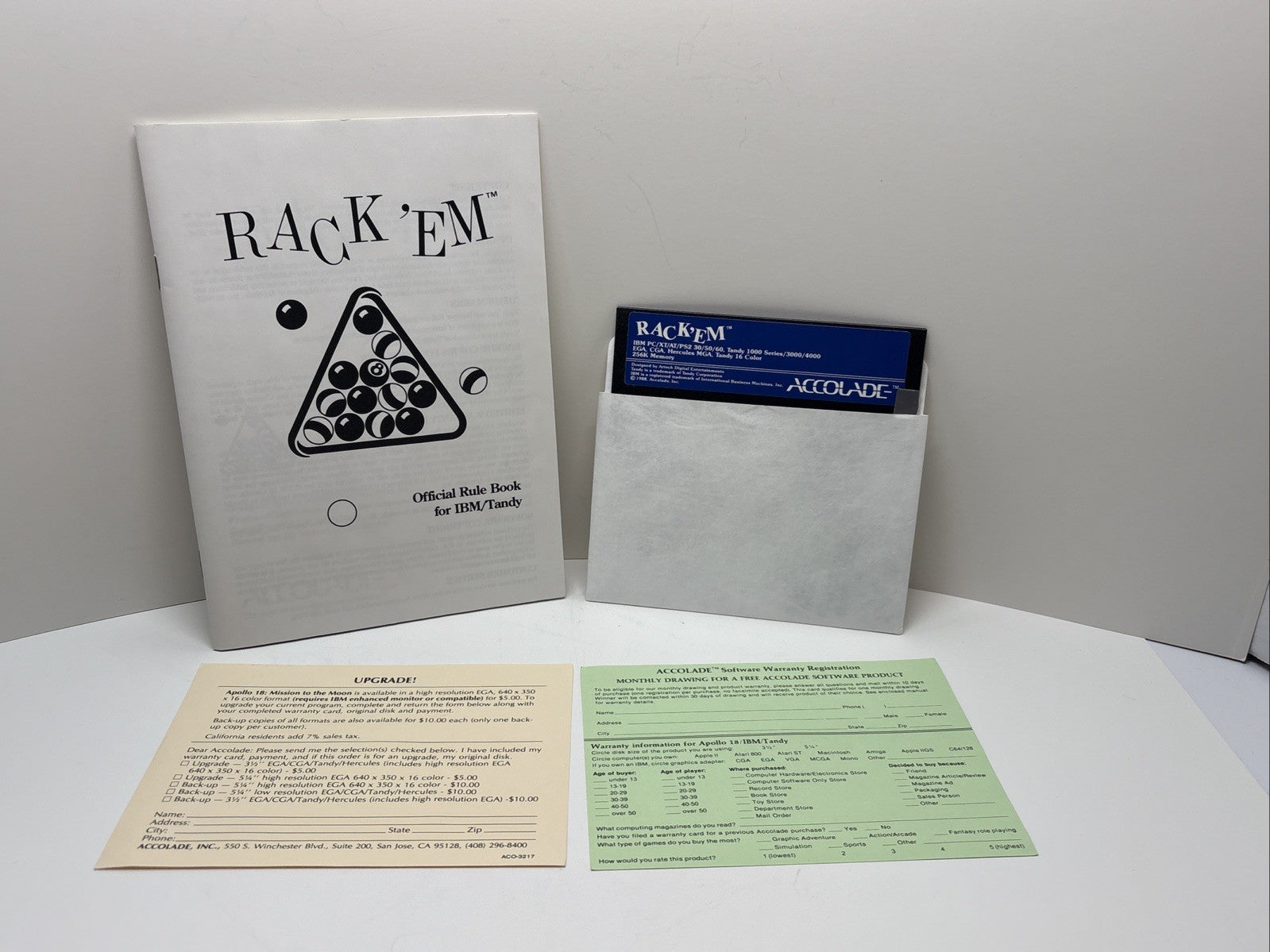 Rack Em Accolade IBM PC Tandy Floppy Disk Game Complete In Box CIB