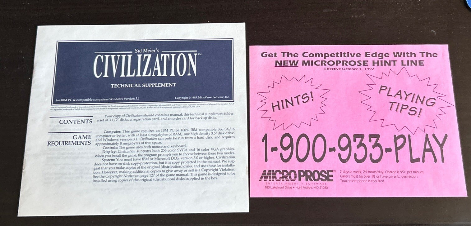 Sid Meier's Civilization (1991) - Microprose, IBM- Technical Supplement And Hint Inserts